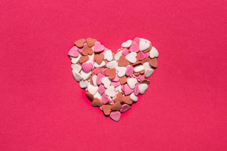 heart candies in the shape of a heart on a red textured background focus on front candies