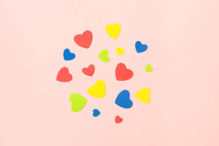 Top view of multicolored hearts on light pink background. Valentines day minimalistic background with copy space