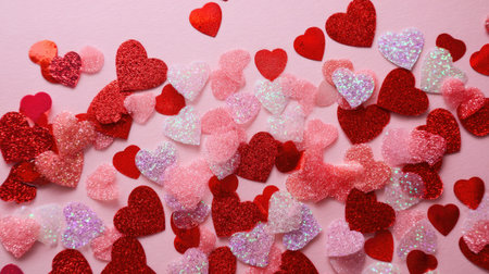 A vibrant and cheerful arrangement of glittery hearts in various shades of pink and red laid on a soft pink background, perfect for festive or romantic themes.