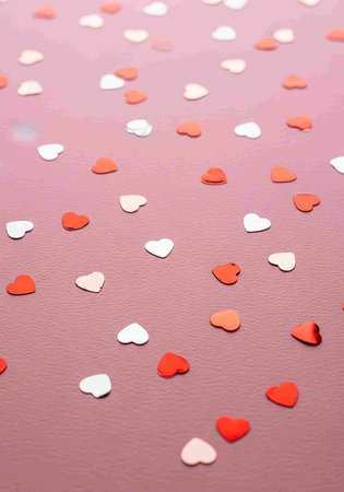 A close-up of a white surface scattered with numerous red and pink hearts, creating a romantic and festive backdrop for Valentine's Day.