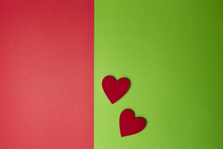 Two red hearts on colored paper background. Minimal style. Flat lay. Top view. Copy space for text