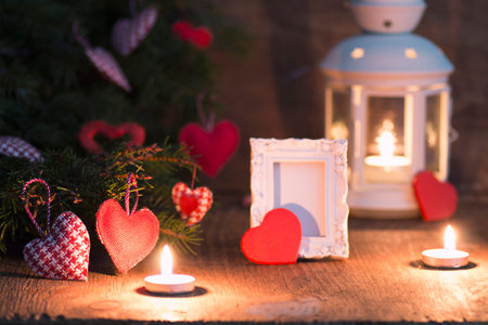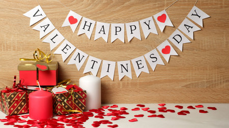 Happy Valentines day white flags garland, gifts with metallic ribbons, bows and labels with hearts, wax candles, red silk hearts on wood background. Love, Valentine's, romantic, rendezvous template