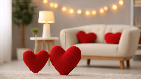 Cozy Modern Living Room with Heart Garlands and Festive Decor in a Winter Wonderland Setting. Concept of Holiday Spirit, Seasonal Warmth, Home Decorating for Christmas, Elegant Festivities. Valentine's Day.