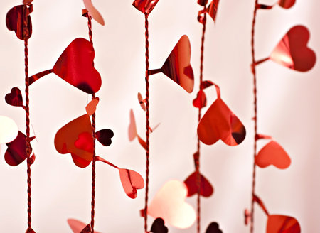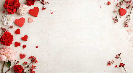 A close-up of a white surface scattered with numerous red and pink hearts, creating a romantic and festive backdrop for Valentine's Day.