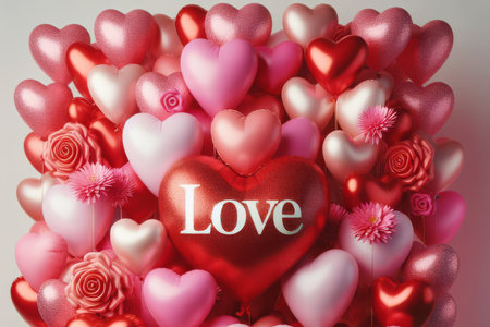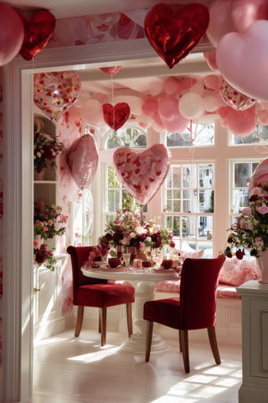 Romantic Cozy Cafe Setting with Heart-Shaped Balloons and Roses Concept of Love and Intimate Gatherings in a Modern Urban Environment. Valentine's Day.