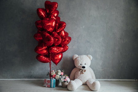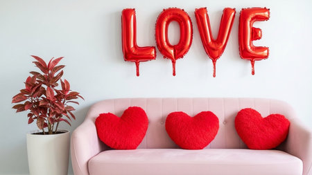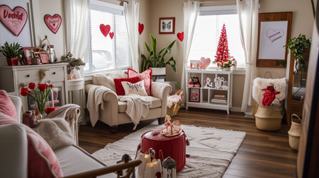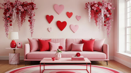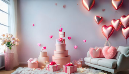 Bright Modern Living Room with Heart Balloons and Roses Celebrating Love and Romance. Valentine's Day.