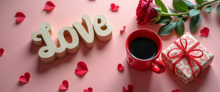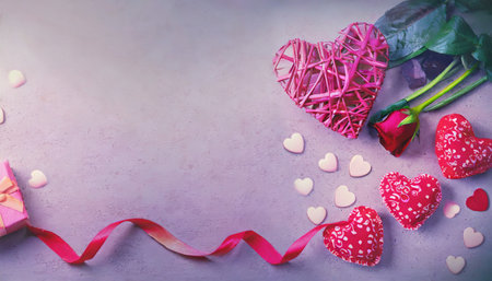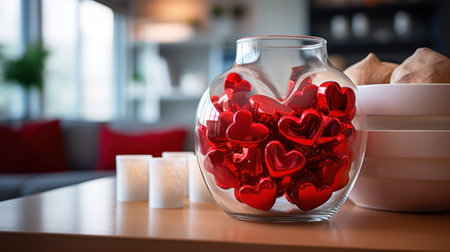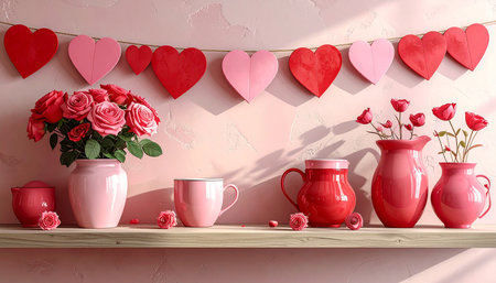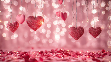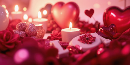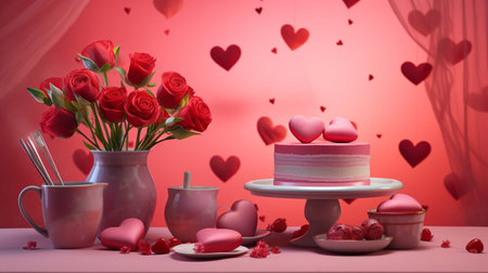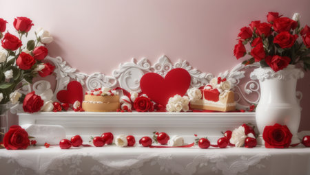 Romantic valentine's day decor with red roses and heart-shaped ornaments in a warm, glowing light. concept of love, celebration, romantic atmosphere.
