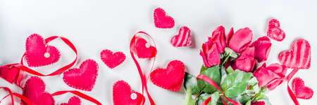 Valentines Day background with handmade red textile hearts,red ribbon and roses. White background flay lay pattern top view copy space