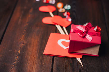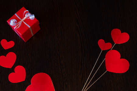 A red box tied with a white ribbon and red cardboard hearts, for Valentine's Day. Attributes of Valentine's day, on a brown, textured background, with a wood texture.