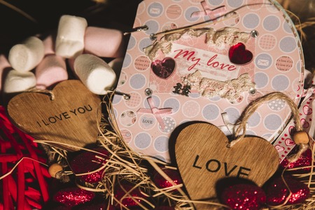 The word love is made of wooden letters on square chocolates. Around cut out hearts from foil. Valentine's day flat lay. High quality photo