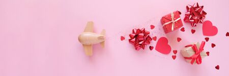Valentine's Day holiday concept. On a pink background, valentine's day. Air travel. selective focus