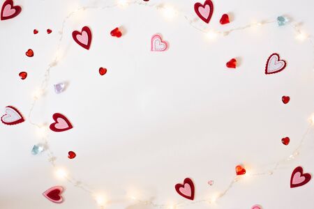 Creative Valentine's day card with space copying. Various hearts on a white background-frame with lights