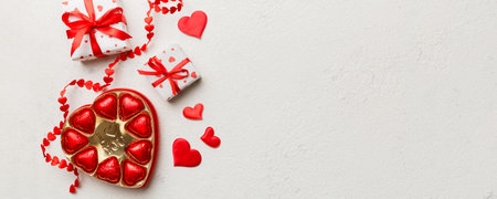 Delicious chocolate pralines in box for Valentine's Day. Heart shaped with gift box of chocolates top view with copy space.