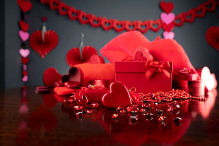 Valentines day concept. Red hearts, boxes with valentines gifts and valentines decorations on the glass table.