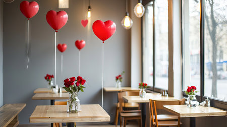 Cozy Modern Cafe with Heart-Shaped Balloons and Roses Floating Near Windows. Concept of Romantic Atmosphere, Love Celebration, Cozy Decor, and Urban Lifestyle. Valentine's Day.