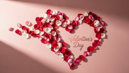 A heart shape is artfully composed of numerous scattered red, pink, and white rose petals against a soft pink surface, with subtle shadows adding depth.