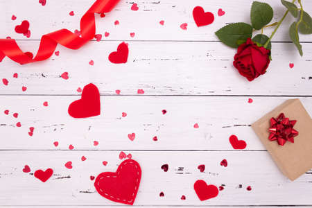 Gift, rose and red hearts on white wooden background, top view. Copyspace, a Valentine's Day concept.