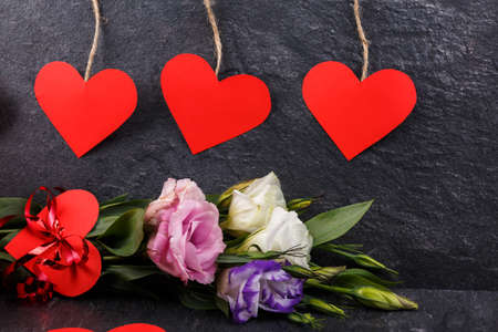 A bouquet of Japanese roses tied with ribbon with hearts red on threads on a stone background