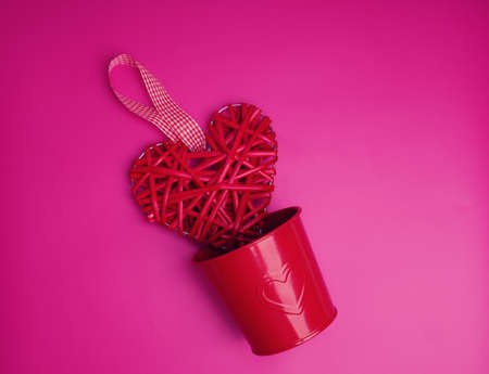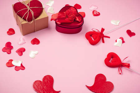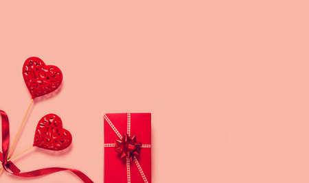Abstract composition with two decorative hearts and red present box on pink paper background. Valentine day theme. Love and romance concept. Flat lay. Top view