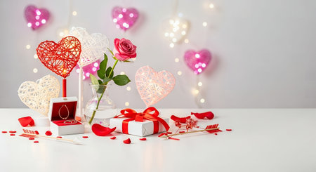 This image features a collection of Valentine's Day decorations, including heart-shaped ornaments, wrapped gifts, flowers, and festive lights, all isolated on a transparent background. The decorations are predominantly red and white, creating a festive and romantic atmosphere. The image is SEO-friendly and suitable for various digital applications.