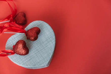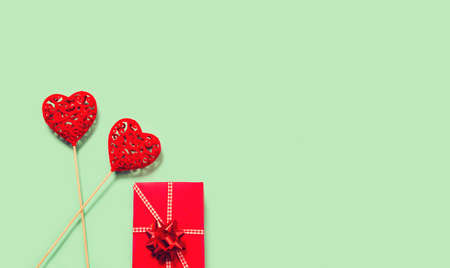 Abstract composition with two decorative hearts and red present box on colorful background. Valentine day theme. Love and romance concept. Flat lay. Top view