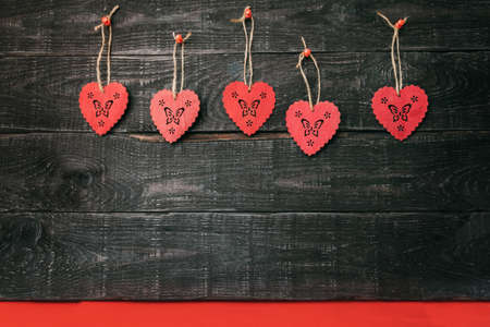 A row of red hearts from felt. Background for congratulations on Valentine's Day. Background for sale. Black lettering paper.