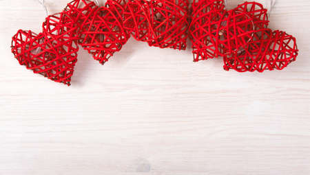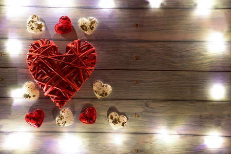 Red lights in the shape of the beautiful hearts on the light wood background. St Valentines concept with copy space.