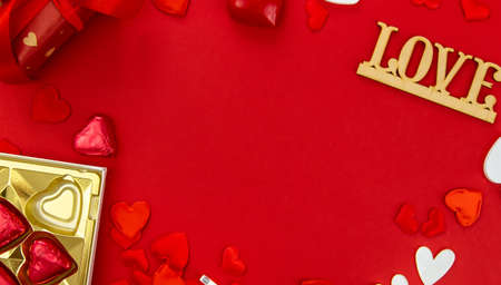 The word love is made of wooden letters on square chocolates. Around cut out hearts from foil. Valentine's day flat lay. High quality photo