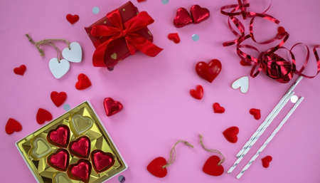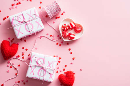 Happy Valentines Day concept. Overhead view of gift boxes, red hearts, sweets on pink background.
