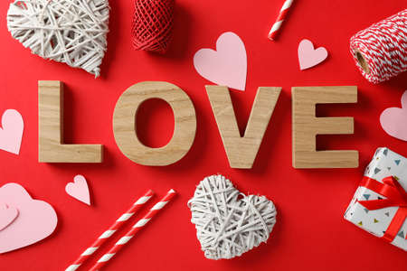 Inscription Love made of wooden letters on decorated background, top view