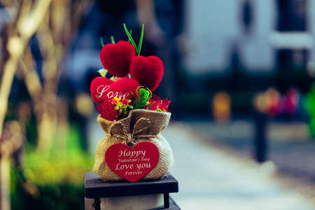 Valentine's Day heart-shaped gift in a bag on the balcony in dark tone.