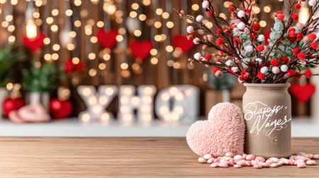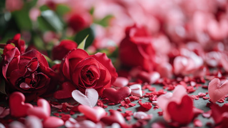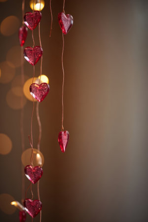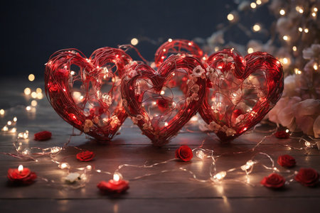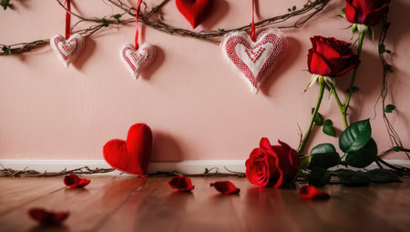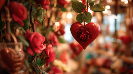 This enchanting image showcases heart decorations amid beautiful roses, set in a softly lit background, creating a romantic atmosphere ideal for special occasions.