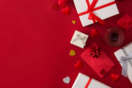 Gift boxes, red paper envelope and red hearts on red background. Copy space