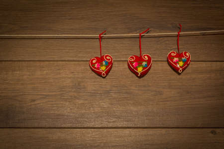 Valentines day background with red hearts hanging on the ropes.