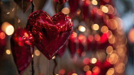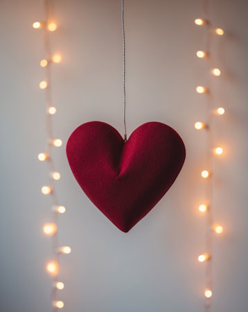 AI Generated. A red heart hangs from a string of lights