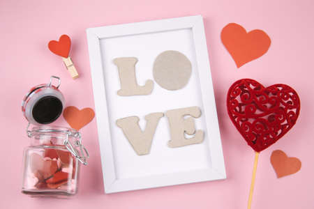 top view white frame with letters L O V E , red heart and jar with hearts on a pastel pink background