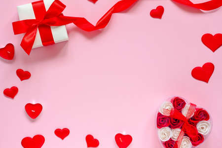 The concept of Valentines Day, wedding, birthday. A box with roses, red hearts, a gift with a satin ribbon and candles on a pink background. Flat lay, copy space.