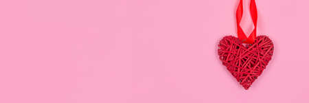 Banner with red heart - as a symbol of love, on pink background with copy space for your text - St. Valentines Day celebration concept. Love backdrop for greeting card, selective focus