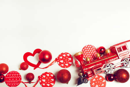 Top view photo of christmas tree decorations red heart-shaped balls and sequins on isolated red background with copyspace