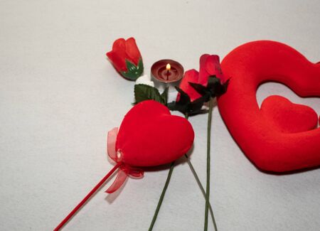 Valentines Day background with handmade red textile hearts,red ribbon and roses. White background flay lay pattern top view copy space