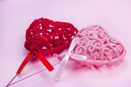 Two bright red and pink color toy hearts on soft romantic background. St Valentines Day celebration and love concept.