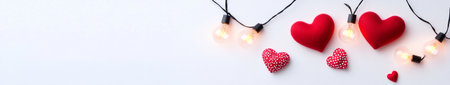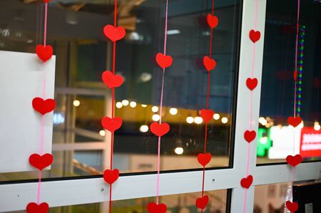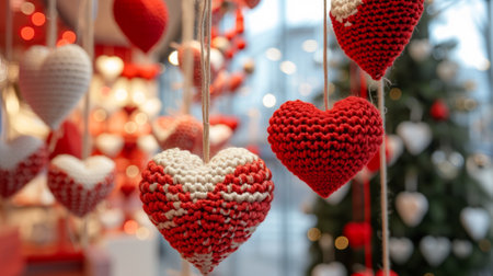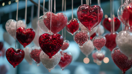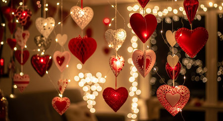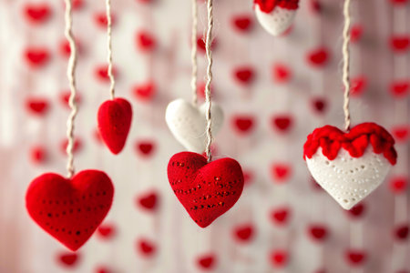 A vibrant garland of red and white heart decorations against a soft, blurred background. Perfect for adding a romantic touch to any celebration or event.