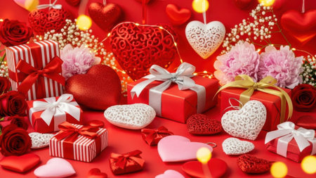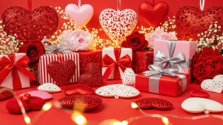 This image features a festive arrangement of Valentine's Day decorations, including heart-shaped ornaments, gift boxes, and flowers, all isolated on a transparent background. The decorations are predominantly red and white, creating a romantic and celebratory atmosphere. Ideal for Valentine's Day themes and digital designs.