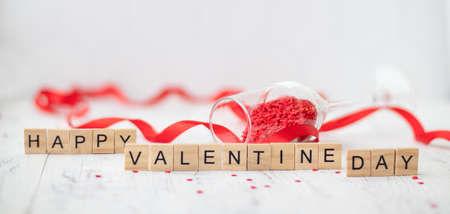 happy st. Valentine's day greetings card. Wooden letters on the white background with small scattered red hearts and overturned champagne glasses