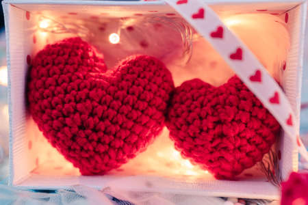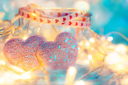 Two red hearts and sparkling festive garland in dark settings. Desktop, copy space. vintage style. Concept of love and romance. Beautiful background for Valentines Day.