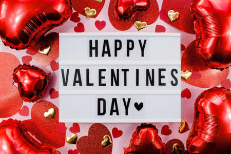 Stylish text frame lightbox with the inscription happy Valentine's day. Pink, red and beige hearts all around. Foil balloons top view of Valentine's Day. Copyspace.