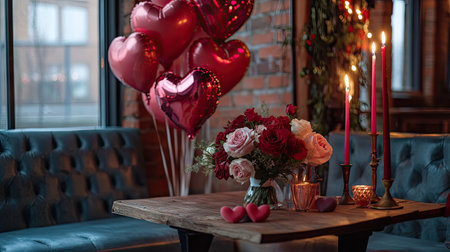 Romantic Valentine's Day setup with heart-shaped balloons, candles, and flowers on a table.
