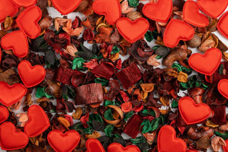 Different dry flowers with red hearts background