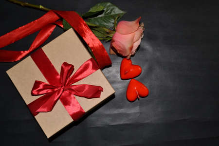 Gift box with a red bow, pink rose and aroma candles on a dark background. Top view
