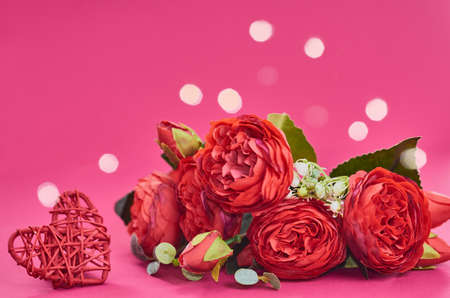 Bouquet of red roses on a pink background, bokeh. Festive background for Valentines Day, birthday, wedding, March 8. Front view, copy space. Nobody.
